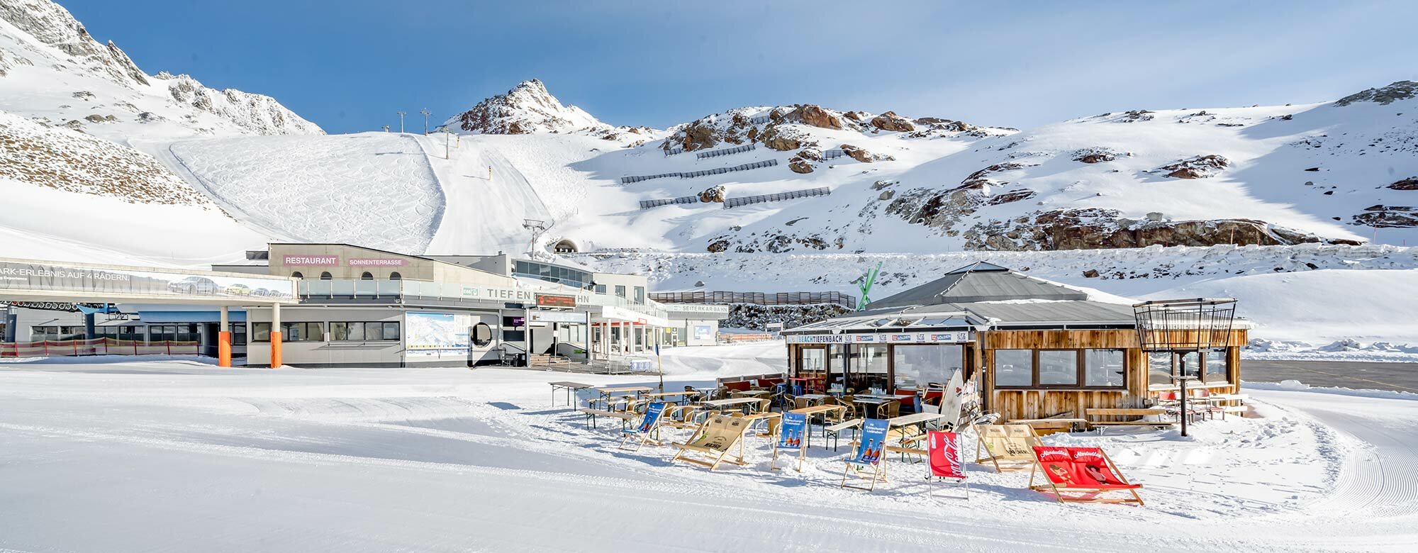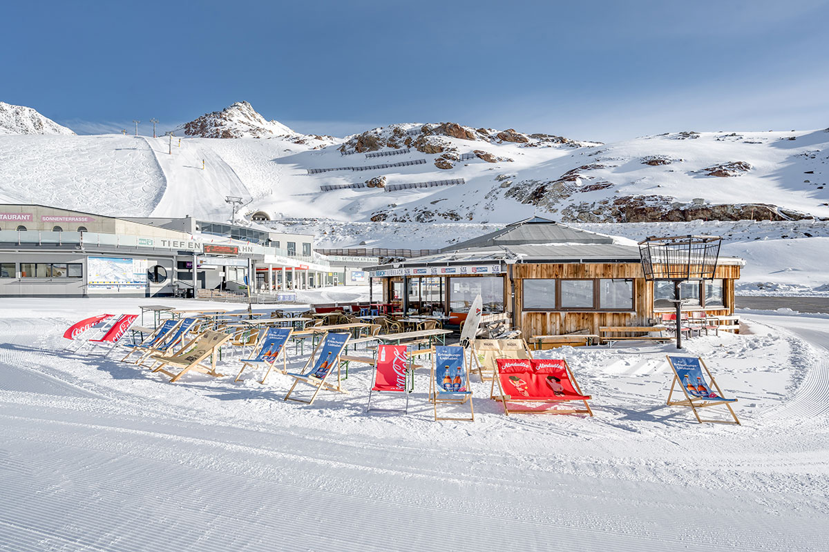 Thirsty? Then ski down the blue slope number 38. You will find the snow beach with sun loungers and a rustic relax hut right next to Tiefenbach mountain gondola or next to Tiefenbach Glacier Restaurant.